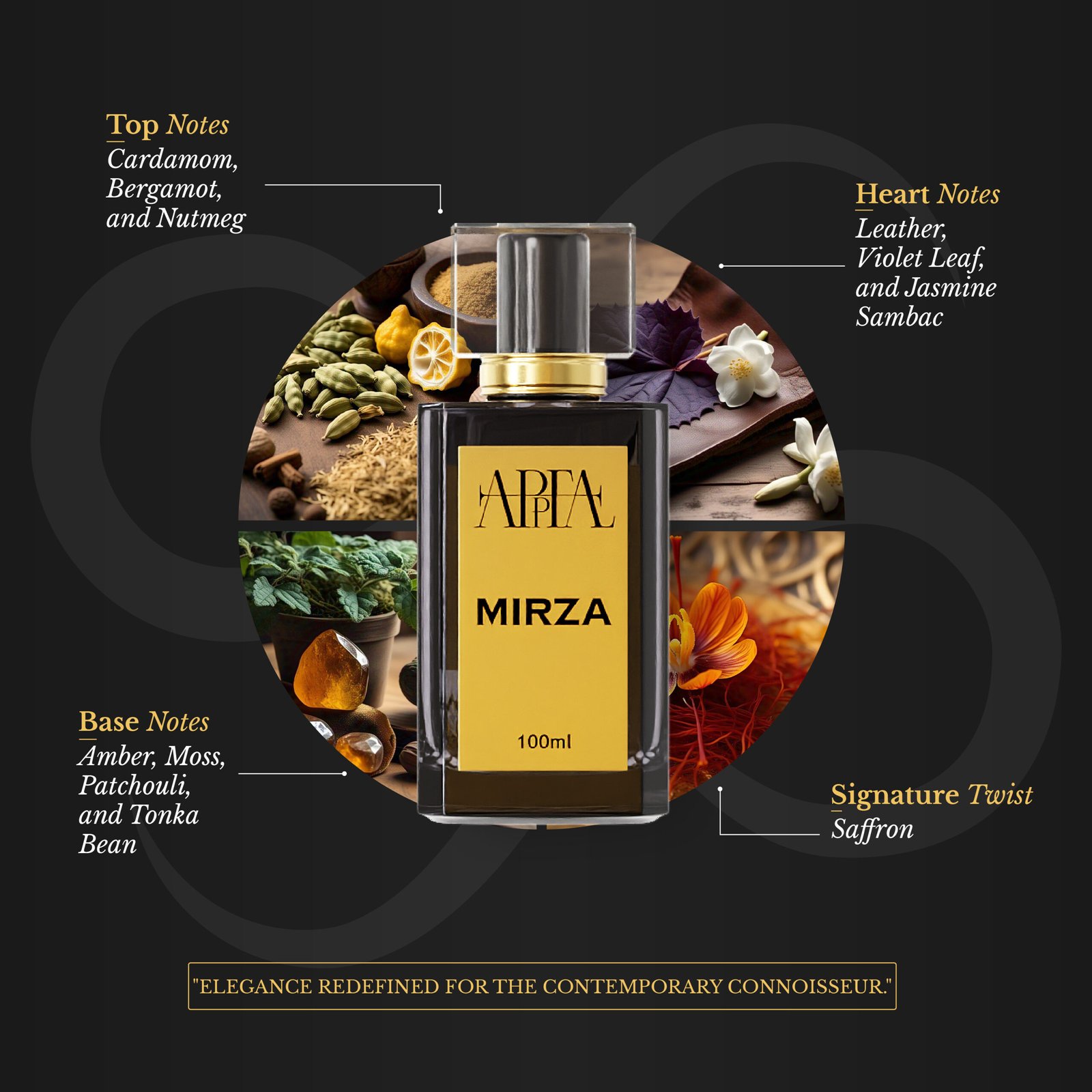 Inspired by Persian heritage, Mirza is more than a fragrance, it’s a symbol of power, strength, and regality. Its deep, dark accords with golden warmth evoke the presence of a true nobleman. Step into a world where scent defines royalty.
